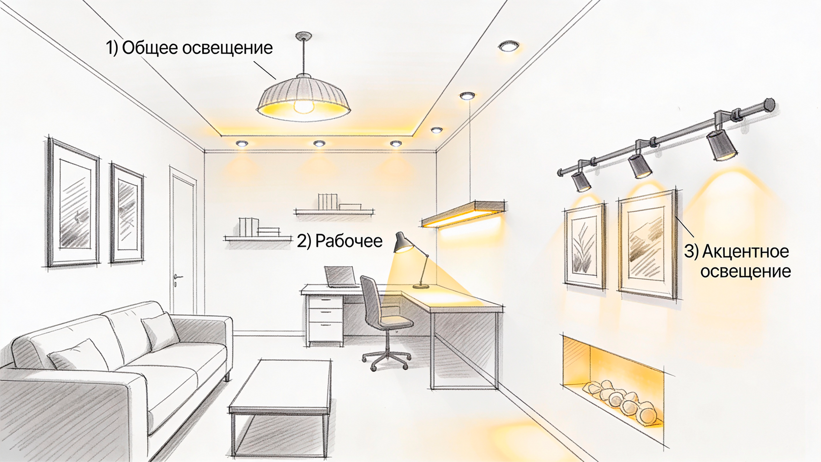 Пример: Рассчитаем свет для гостиной площадью 20 м² с потолками 3 м.